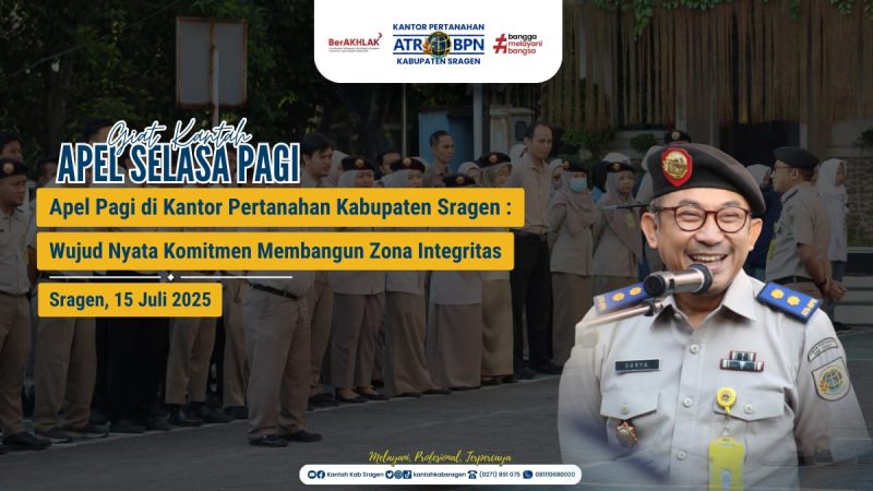 Sragen — Dalam rangka mendukung berjalannya Reformasi Birokrasi secara berkelanjutan, Kantor Pertanahan Kabupaten Sragen menggelar apel pagi rutin pada Selasa, 15 Juli 2025, yang berlangsung di halaman kantor. Bertindak sebagai pembina apel, Kepala Seksi Penataan dan Pemberdayaan, Soeryantara Adhi Sasana, menyampaikan sejumlah arahan penting.