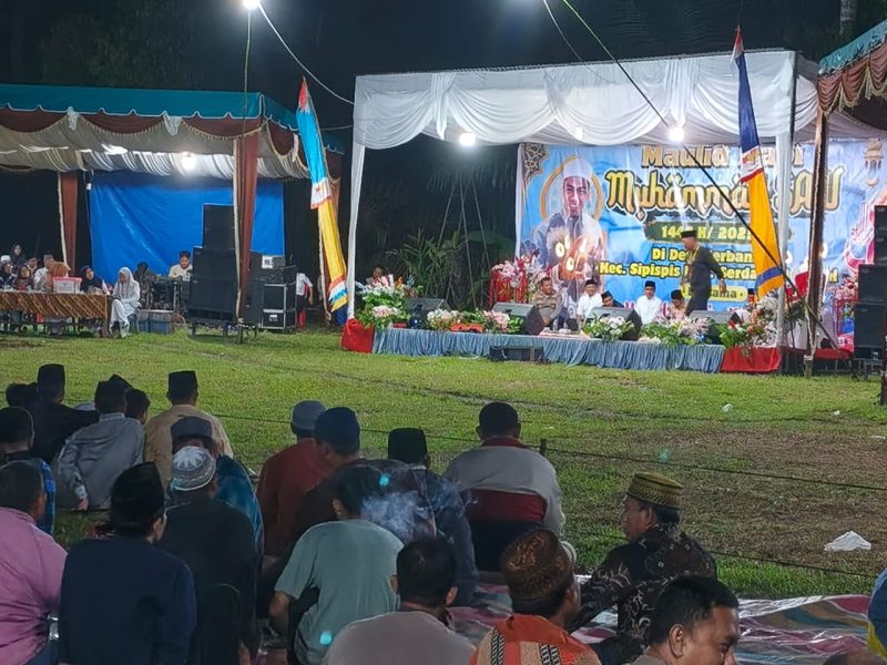 TEBING TINGGI – Polsek Sipispis Polres Tebing Tinggi yang dipimpin oleh Kapolsek AKP Jaresman Sitinjak, SH, MH melaksanakan pengamanan pada kegiatan Peringatan Maulid Nabi Muhammad SAW 1447 H / 2025 M di Lapangan SD Serbananti Kecamatan Sipispis, Kabupaten Serdang Bedagai, Rabu malam (17/9/2025).