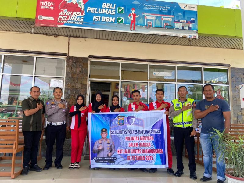 BATU BARA – Satlantas Polres Batu Bara dipimpin Kasat AKP Simon E. Simatupang, S.H, M.H, melaksanakan gelaran Polantas Menyapa di SPBU Petatal, Batu Bara, Sumatera Utara, Kamis (18/9) Pukul.12.30 Wib.