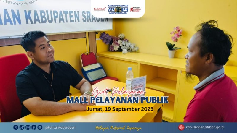 Sragen – Kantor Pertanahan Kabupaten Sragen kembali membuka layanan rutin di gerai Mall Pelayanan Publik (MPP) Sragen pada Jumat (19/09). Kehadiran layanan ini merupakan upaya Kantah Sragen untuk semakin dekat dengan masyarakat dan memudahkan akses terhadap layanan pertanahan.