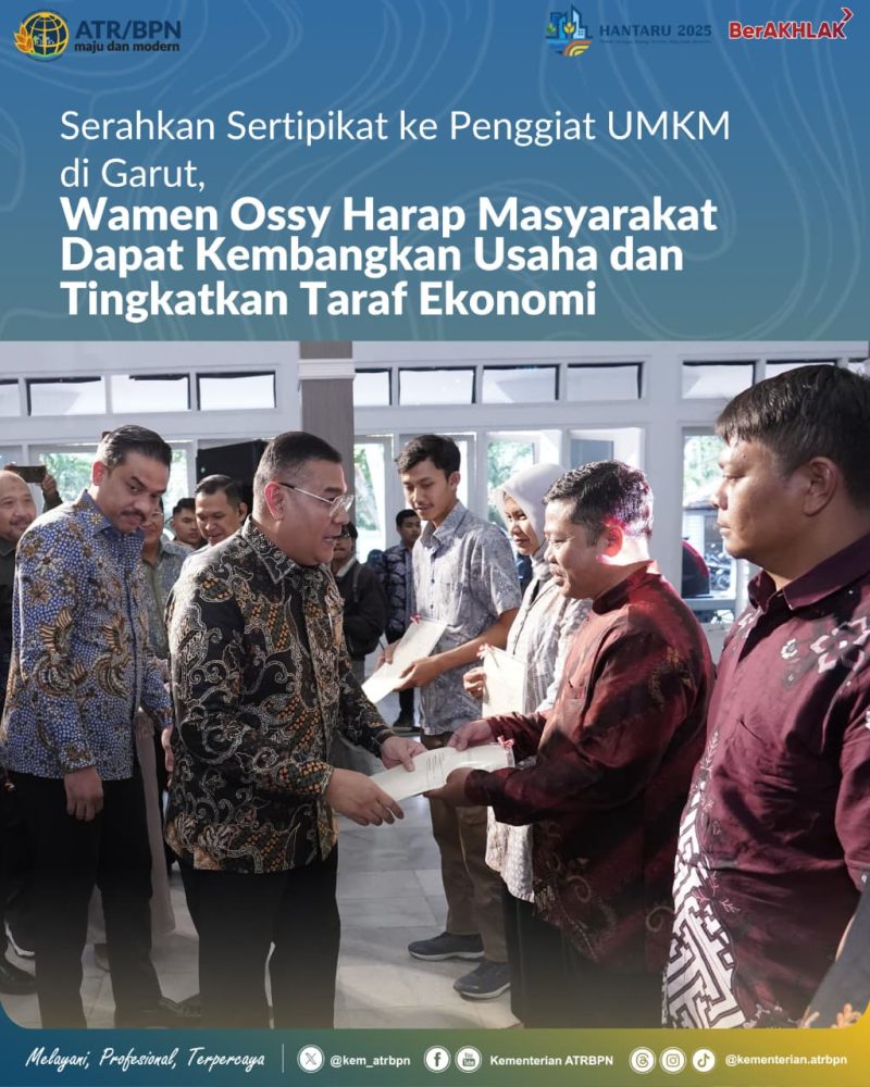 Garut – Wakil Menteri Agraria dan Tata Ruang/Wakil Kepala Badan Pertanahan Nasional (Wamen ATR/Waka BPN), Ossy Dermawan, menyerahkan sertipikat tanah kepada 10 penggiat Usaha Mikro, Kecil, dan Menengah (UMKM) dalam rangkaian acara Lokomotif Akses Permodalan (LOKAMODAL), Kamis (25/09/2025). Di momen tersebut, Wamen Ossy menekankan bahwa sertipikat tanah bukan sekadar dokumen legal, tapi modal penting bagi masyarakat.