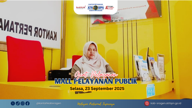 Sragen – Dalam rangka meningkatkan aksesibilitas layanan, Kantor Pertanahan Kabupaten Sragen kembali menghadirkan layanan piket di Gerai Mall Pelayanan Publik (MPP) Sragen pada Selasa, 23 September 2025. Langkah ini menjadi bagian dari upaya nyata untuk mempermudah masyarakat dalam memperoleh informasi dan pelayanan pertanahan. Melalui pemanfaatan MPP sebagai pusat pelayanan terintegrasi, BPN Sragen menunjukkan keseriusannya dalam menyediakan layanan yang lebih cepat dan efisien.