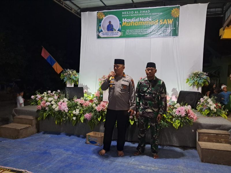 TEBING TINGGI – Kapolsek Dolok Merawan Polres Tebing Tinggi, Iptu Herman Sentosa, SH, MH bersama Bhabinkamtibmas Aipda Benny Sunfathi menghadiri acara peringatan Maulid Nabi Muhammad SAW 1447 H/2025 M. Kegiatan digelar di Masjid Al-Jihad Dusun V Desa Dolok Merawan, Kecamatan Dolok Merawan, Kabupaten Serdang Bedagai pada Sabtu malam (27/9/2025).