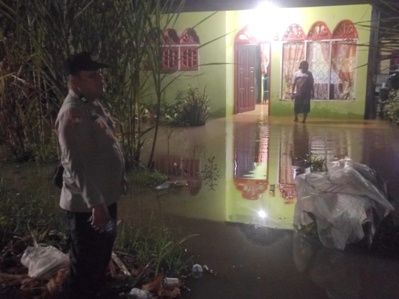 BATU BARA – Personil Polsek Lima Puluh Polres Batu Bara, Aiptu Elijon H. Manurung, bersama Aiptu Adi K. Damanik, melakukan monitoring banjir di Dusun II Desa Kuala Gunung, Kecanatan Datuk Lima Puluh, Batu Bara, Sumatera Utara, Kamis (2/10) Pukul.22.00 Wib.