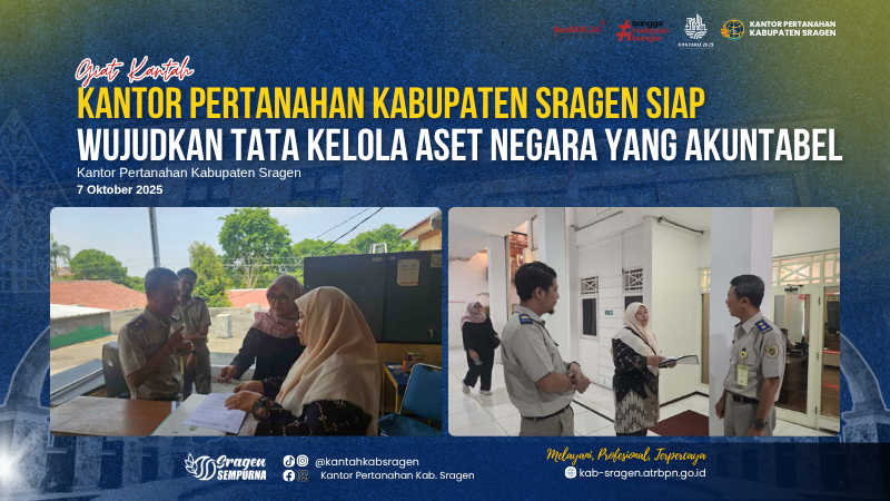 Sragen — Kantor Pertanahan Kabupaten Sragen menerima kunjungan dari Kantor Pelayanan Kekayaan Negara dan Lelang (KPKNL) Surakarta, Selasa (7/10/2025). Kunjungan ini dilaksanakan dalam rangka kegiatan pengukuran kinerja/portofolio Barang Milik Negara (BMN).