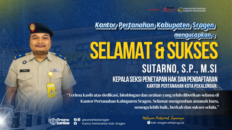 Selamat Sukses atas Dilantiknya Sutarno, S.P M.Si sebagai Penetapan Hak dan Pendaftaran Kantor Pertanahan Kota Pekalongan