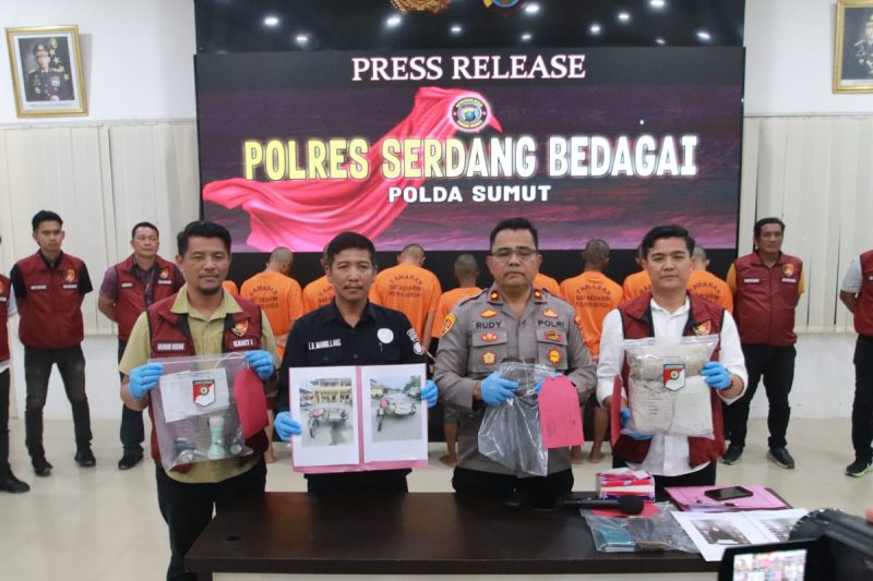 “Kesembilan terduga tersangka ini diamankan dari lokasi berbeda dan di jam yang berbeda”, Sebut Wakapolres Sergai Kompol Rudy Candra, S.H, M.H, saat memimpin konferensi pers bersama Kasat Reskrim Iptu Binrod Situngkir, S.H, M.H, Kanit 1 Pidum Sat Reskrim Ipda Hendri Ika Panduwinata, S.H, M.H, dan Kasi Humas Iptu L.B. Manullang, S.H, di Mapolres Sergai Jalan Negara Sei Rampah Sumatera Utara, Kamis (23/10).