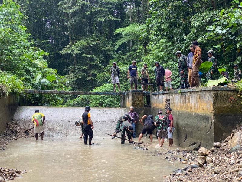 SKOUW, Senin (27/10/2025) – 16 (enam belas) personil Satgas Pamtas RI-PNG Statis Yonif 643/Wns Dipimpin Kapten Inf Nanang yang terdiri dari 6 (enam) unsur pengamanan dan 10 (sepuluh) unsur yang terlibat langsung bahu-membahu normalisasi saluran air bersama masyarakat dan Stakeholder wilayah PLBN Skouw.