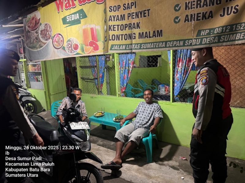 BATU BARA – Personil Sat Samapta Polres Batu Bara melaksanakan Patroli, dan Cooling System dalam mencegah terjadinya aksi 3C dan tindak kejahatan lainnya di Wilayah Hukum Polres Batu Bara. Giat Patroli dilaksanakan dengan menyambangi masyarakat yang berada di Warung Pak Ijo Lima Puluh, Batu Bara, Sumatera Utara, Minggu (26/10) Pukul.23.30 Wib.