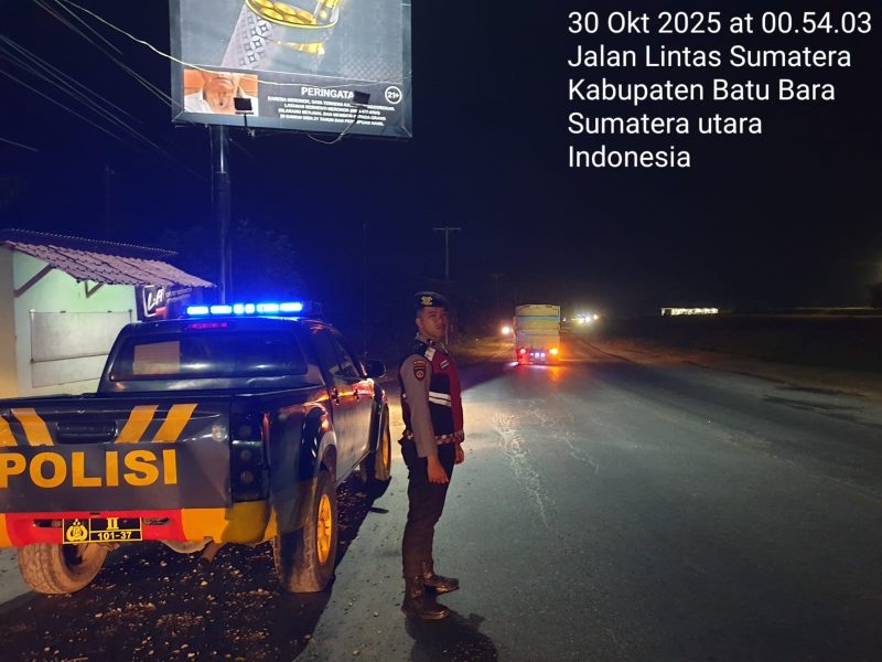 BATU BARA – Dalam menjaga keamanan dan ketertiban masyarakat di malam hari, Sat Samapta Polres Batu Bara melaksanakan kegiatan patroli kota blue light di Perlintasan Jalinsum Simpang Rel Pontas, Kecamatan Lima Puluh, Batu Bara, Sumatera Utara, Kamis (30/10) Pukul.01.00 Wib.
