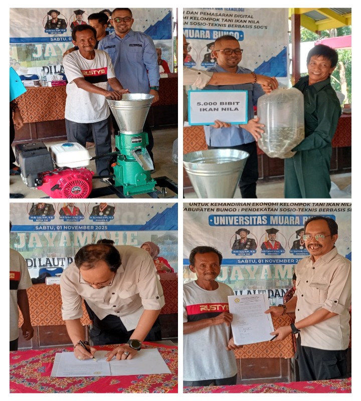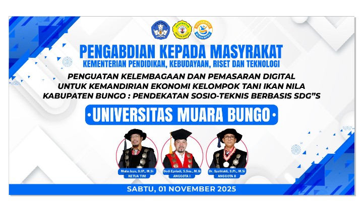 Ungkapberita.com, Bungo – Sebagai Pengabdian Kepada Masyarakat, Universitas Muara Bungo melaksanakan kegiatan Penguatan Kelembagaan dan Pemasaran Digital untuk Kemandirian Ekonomi Kelompok Tani Ikan Nila Kabupaten Bungo dengan Pendekatan Sosio-Teknis berbasis Sustainable Development Goals (SDGs) di Kampus Fakultas Perikanan UMB Sungai Binjai, Sabtu (01/11/2025).