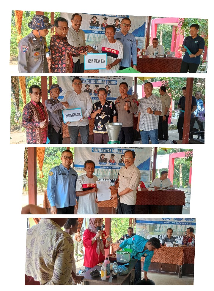 Pada Moment ini Tim Pengabdian Kepada Masyarakat UMB Bungo memberikan bantuan hibah berupa peralatan mesin pakan pelet, mesin dinamo, bahan pakan pelet, Blender Chopper dan bibit ikan nila sebanyak 5000 ekor. Peralatan tersebut diserahkan langsung kepada Kelompok Tani Ikan Nila Embung Telago Air Hitam Sepunggur oleh Tim Pengabdian Masyarakat Universitas Muara Bungo, khusus untuk Chopper Blender di serahkan kepada Fakultas Perikanan.