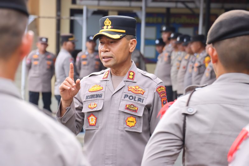 TEBING TINGGI, – Kapolres Tebing Tinggi AKBP Drs. Simon Paulus Sinulingga, S.H. memberikan arahan kepada 25 siswa SPN Hinai Polda Sumut yang sedang melaksanakan Latja (latihan kerja) di Polres Tebing Tinggi, Senin pagi (3/11/2025).