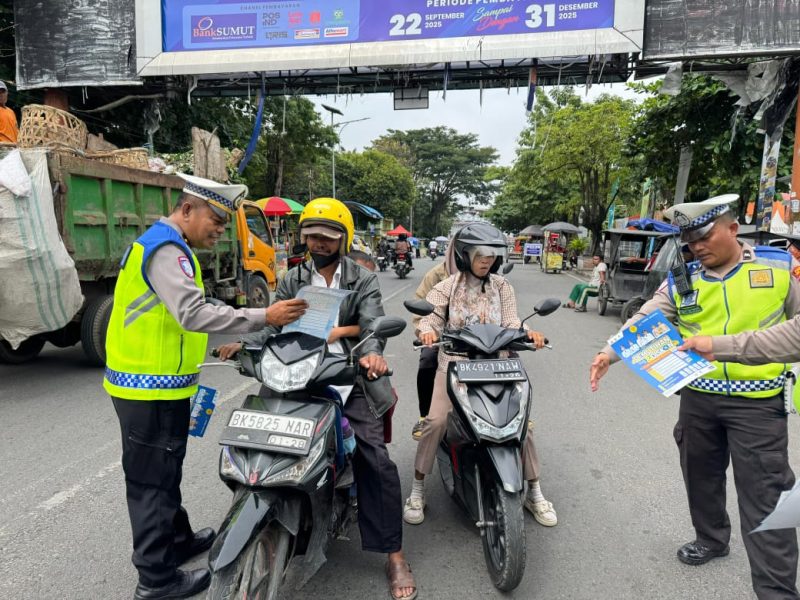 TEBING TINGGI, – Unit Kamsel Sat Lantas Polres Tebing Tinggi bersama anggota Sat Lantas menggelar kegiatan Pendidikan Masyarakat (Dikmas) Lalu Lintas dan Pembinaan Penyuluhan (Binluh) serta pembagian brosur pemutihan pajak kendaran kepada masyarakat pengguna jalan yang melintas di Jalan Sutomo Kota Tebing Tinggi, Rabu (5/11/2025).