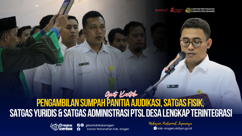 Sragen – Rabu, 5 November 2025, Kantor Pertanahan Kabupaten Sragen menyelenggarakan kegiatan Pengambilan Sumpah Panitia Ajudikasi, Satgas Fisik, Satgas Yuridis, dan Satgas Administrasi dalam rangka pelaksanaan Program Pendaftaran Tanah Sistematis Lengkap (PTSL) Tahun 2025.